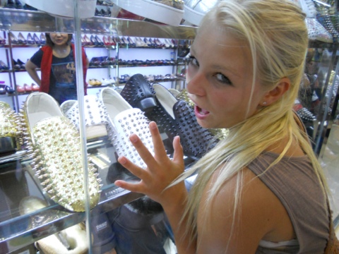 When we arrived at out stop, the kids spied a Kentucky Fried Chicken and to my horror John agreed to eat a late lunch there. After waiting in line for 20 minutes, we managed to point our way with our order and eat. The highlight was the French fries. Hailey kept asking why her popcorn chicken had a pinkish color while John and Stacy managed to get their stringy chicken sandwich down. Hailey’s item turned out to be popcorn shrimp. Not a good day for the colonel! Once fed, we aimed our sights on shopping and the girls were not disappointed. Can you imagine being a female with eight floors of shopping at your disposal? Kallin and Zoe immediately zeroed in on Converse high tops. The beginning asking price was about $55 which was eventually bargained down to a little under $12 each! Kallin got one pair of white while Zoe got a pair in white and red. Unfortunately no shoes in Hailey’s size. From there we moved upward and conquered. John was a good sport. The girls kept giggling while thinking of grandma Judy in a place like this! At every stop the shop keeper would start at an outrageous price and end up practically giving if away. For instance Kallin got a dress for $17 that the beginning asking price was $120! Zoe got a dress for $9 when they asked for $100.